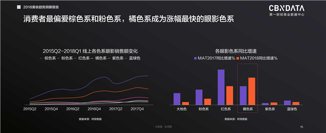 从整个眼部彩妆来看,消费者的注意力已逐渐从眉笔向眼影上转移,凭借良好的销售额增势,跃然成为整体眼部彩妆中销售额最大的类目。而从购买眼影的色系偏好来看,棕色系和粉色系眼影获大众偏爱,而橙色系眼影则因涨幅最快,而从所有色系中脱颖而出。