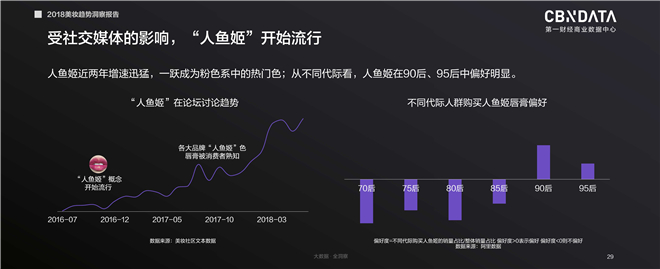 以走红于社交媒体的人鱼姬为例,起初是从韩剧中流行起来的概念,近年来随着越来越多品牌商推出这个色系的产品以及线上KOL的热力推荐,人鱼姬在近两年增速迅猛,一跃成为粉色系中的热门色;从不同代际看,人鱼姬在90后、95后中偏好明显。而随着人鱼姬唇膏的持续流行,也推动了其他品类该色系的流行,人鱼姬眼影、指甲也慢慢受到消费者的喜爱。