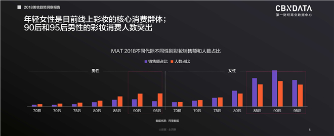 根据CBNData《报告》显示,近年来线上彩妆品类销售额持续高速增长,而越来越多消费者习惯于线上购买彩妆是主要驱动力。其中年轻女性属线上彩妆品类的核心消费群体,且消费力超群,尤其是90后女性消费者不论从人数占比还是消费额占比,均属不同代际女性中最高。与此同时,90后和95后男性亦是不容忽视的彩妆消费群体,显著的消费人数占比增长揭示了男性在彩妆消费上毫不逊色于女性的消费需求,且呈现了逐年增长的态势。