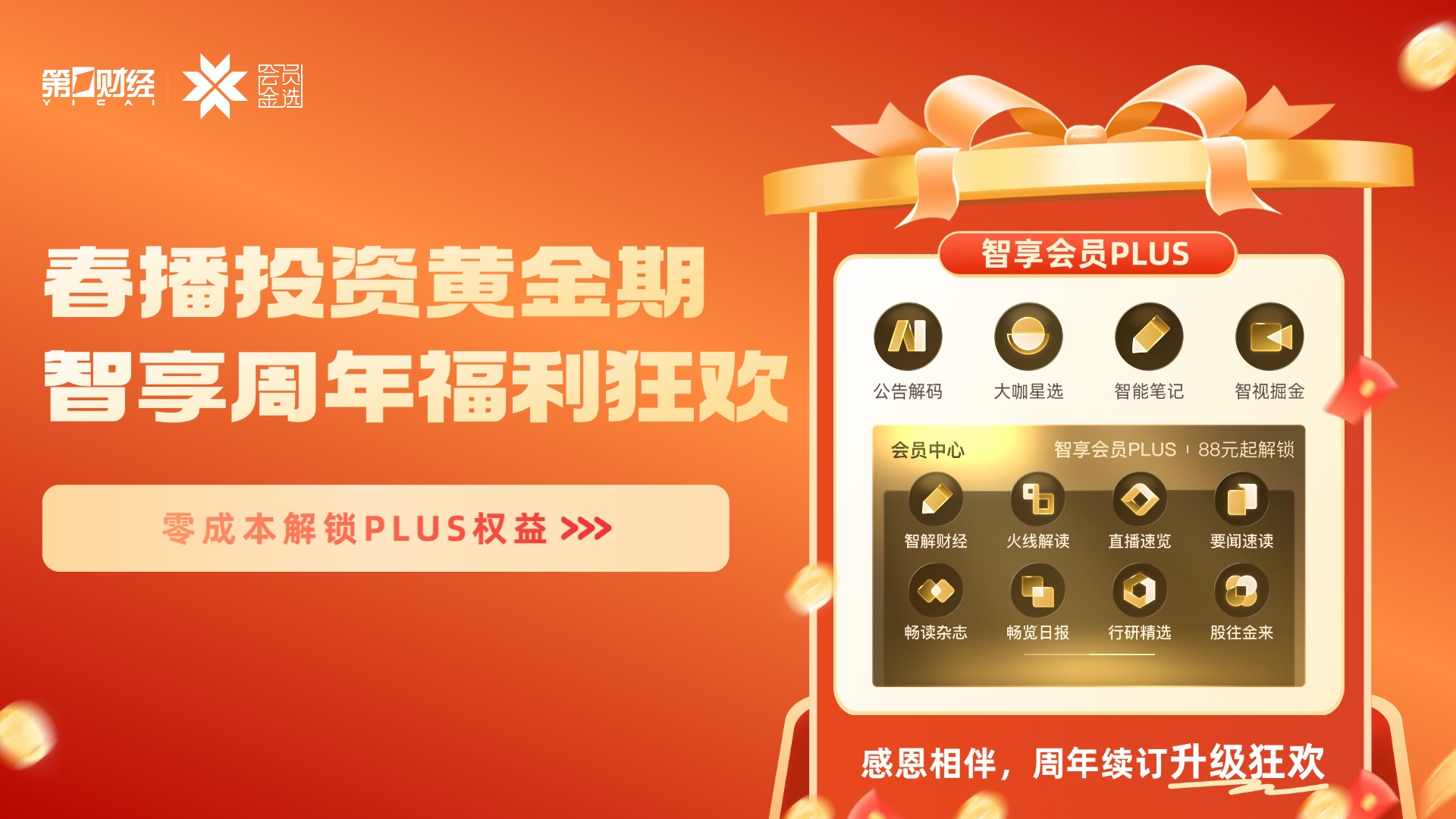 第一财经智享会员上线一周年庆典重磅来袭!专属福利火力拉满,老用户免费升级高阶权益,全周期助力抢占投资窗口,早锁定早获益,错过再等一整年!