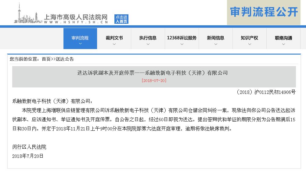 第一财经记者今日在上海市高级人民法院网上查到,闵行区人民法院已于7月20日向乐融致新电子科技(天津)有限公司送达了诉状副本及开庭传票。该院受理了上海增联供应链管理有限公司(下称“上海增联”)诉乐融致新仓储合同纠纷一案,自公告之日起,经过60日即视为送达,并定于2018年11月21日开庭审理。