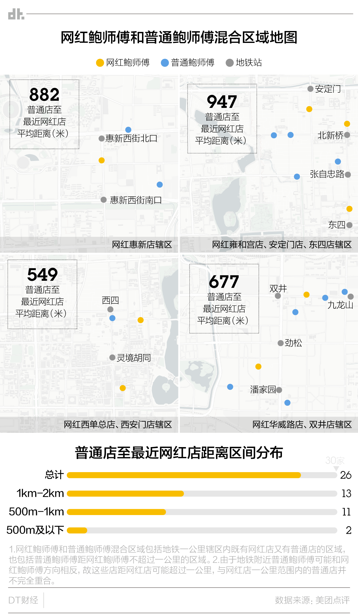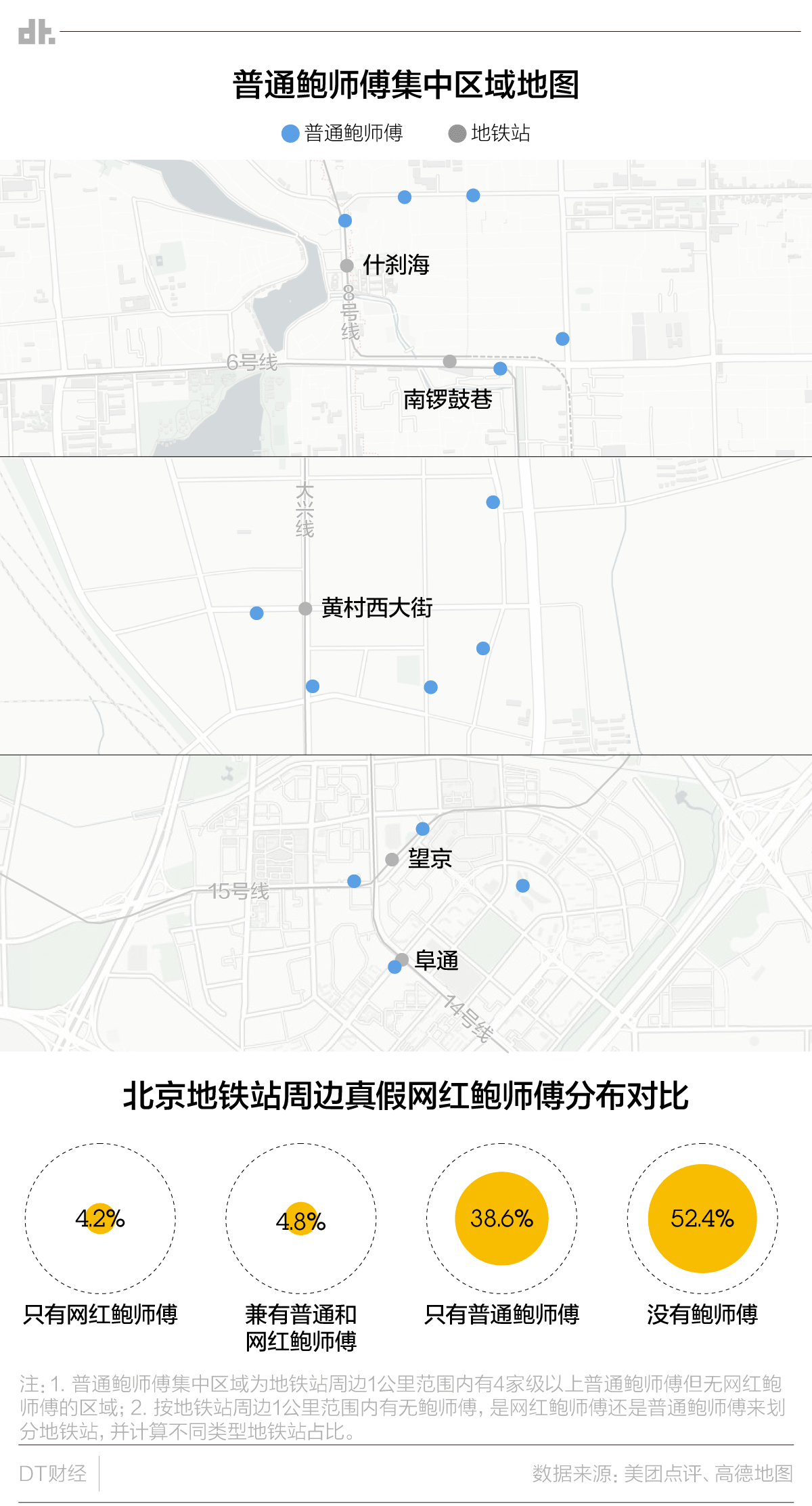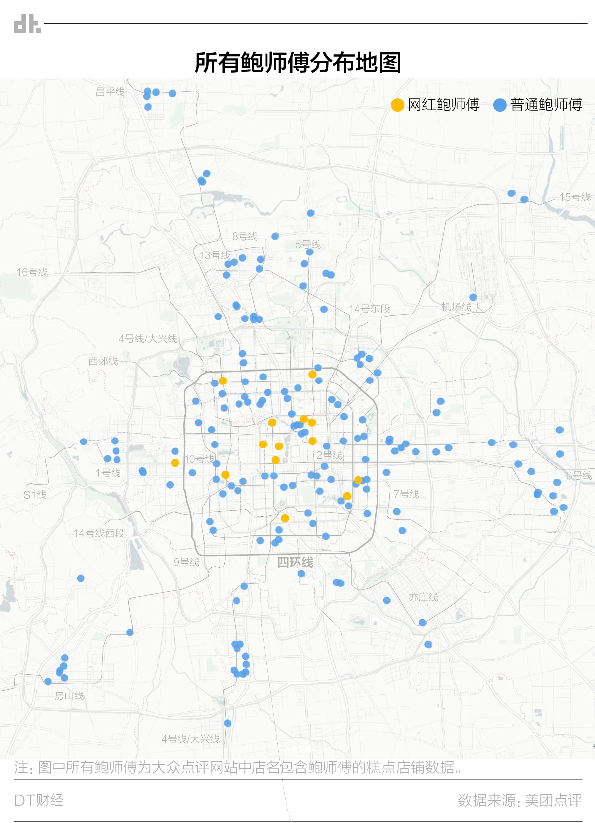 凭借数量优势,普通鲍师傅们遍布全城,在五环内成片出现,只有玉渊潭和丽泽商务区附近相对空白;五环外则沿地铁线路分布。在数量上的压倒性优势造成了一种以假乱真的效果,天真如DT君,就一直被蒙在了鼓里。