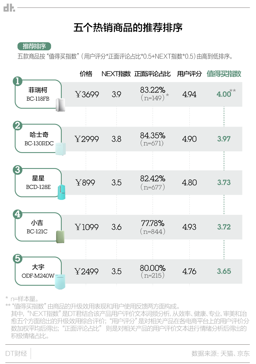 最后,我们结合NEXT指数和电商用户评价③后,计算得出这五款 “值得买指数”④,并将价格也附上,供大家参考: