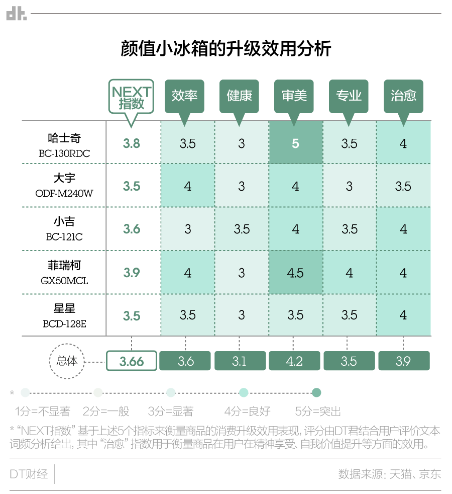 ②“NEXT指数”系基于消费升级研究和用户反馈得出,用于衡量商品的消费升级效用表现。DT君根据商品在效率、健康、专业、审美和治愈五个方面的的升级效用表现给出1-5分的得分,同时依据电商平台上用户评价中提及的重点效用及程度对分数进行加、减分修正;品类的“NEXT指数”得分根据五个代表性商品的得分平均而成。