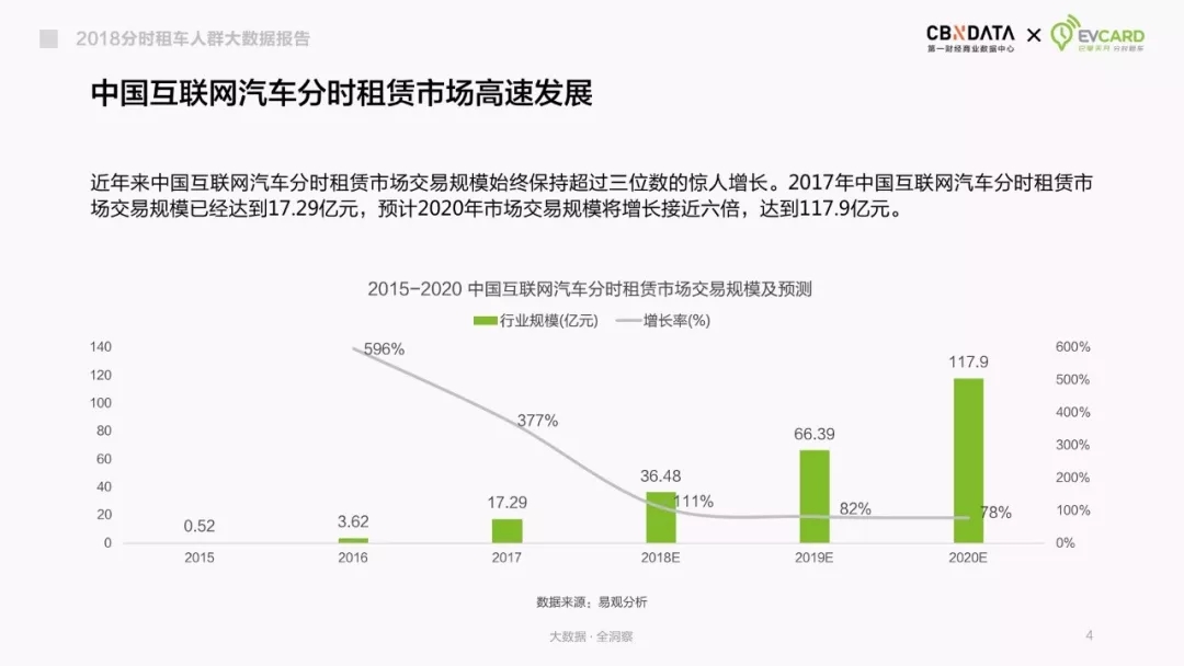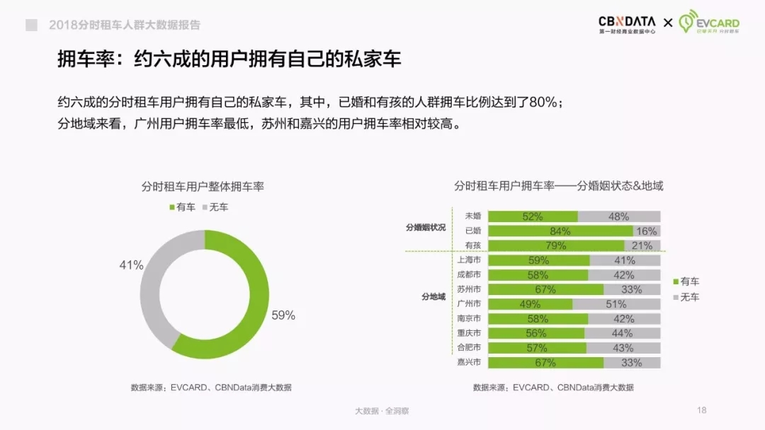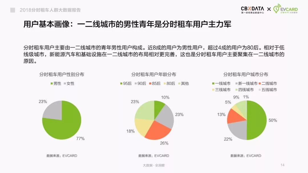 2018年8月6日,第一财经商业数据中心(CBNData)联合EVCARD发布《2018分时租车人群大数据报告》(下简称《报告》),以EVCARD平台数据,结合CBNData消费大数据,还原分时租车用户的出行习惯及线上消费特征,洞悉分时租车作为新兴出行方式对国民生活消费的影响,甄别万亿级中国分时租车市场的风口所向。