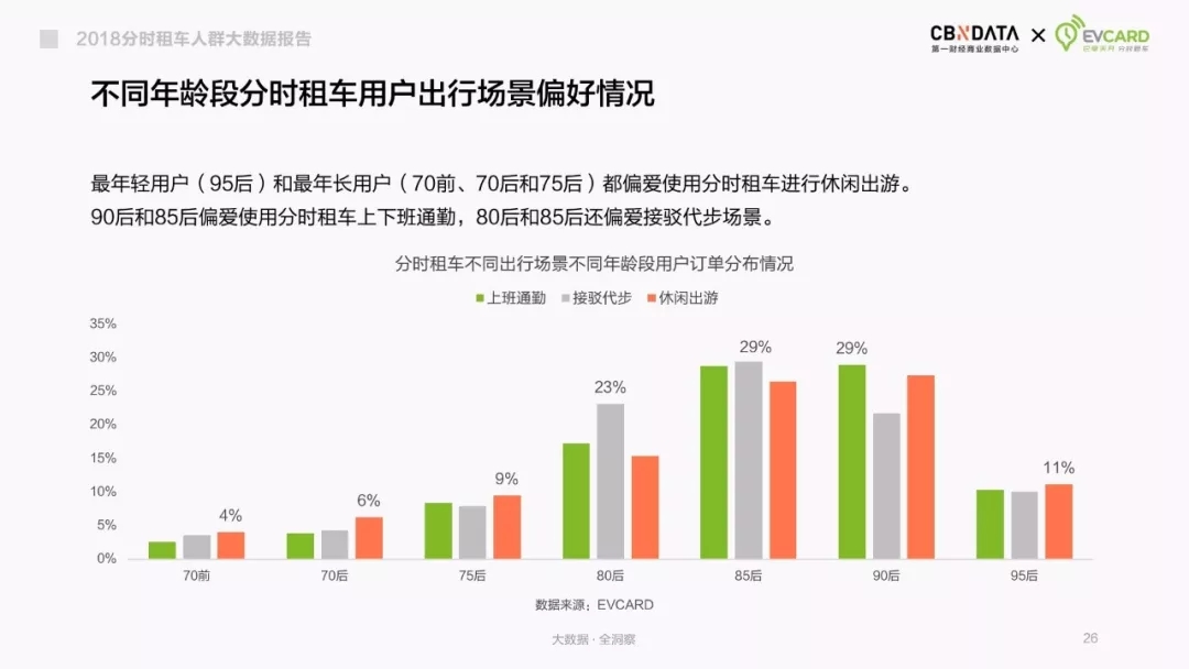 此外,CBNData《报告》发现,不同年龄段分时租车用户的出行场景偏好亦有差异,其中95后和70前、70后和75后用户都偏爱使用分时租车进行休闲出游;90后和85后用户则偏爱使用分时租车上下班通勤;80后和85后还偏爱接驳代步场景。