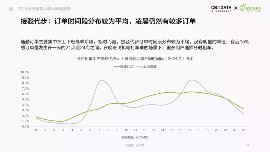 相较于主要集中在上下班高峰时段的通勤订单,接驳代步订单时间段分布较为平均,且近15%的订单发生在21:00~24:00。可见,在晚班飞机等打车难的场景下,分时租车成为很多用户的选择。