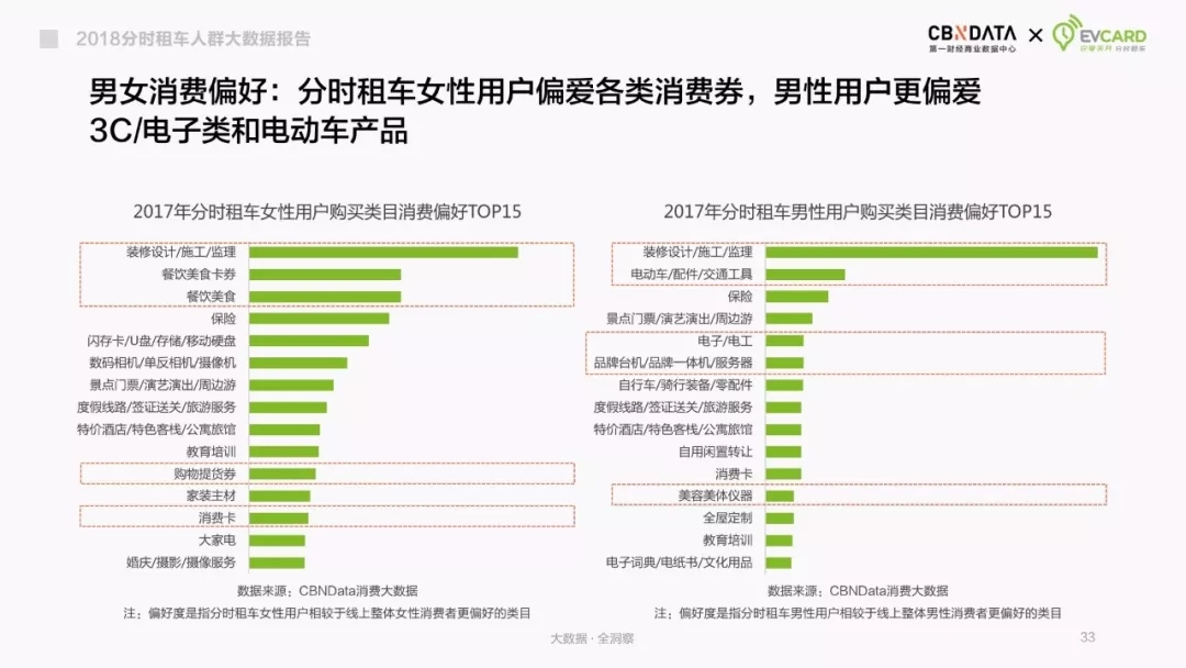从消费偏好来看,分时租车用户相对更乐意购买汽车后市场相关产品。在他们2017年偏好购买的TOP15类目中,装修设计及交通工具配件等相关产品更获偏爱。其中,分时租车女性用户偏爱各类消费券,男性用户更偏爱3C/电子类和电动车产品,整体呈现出分时租车用户注重性价比的实用主义消费观。