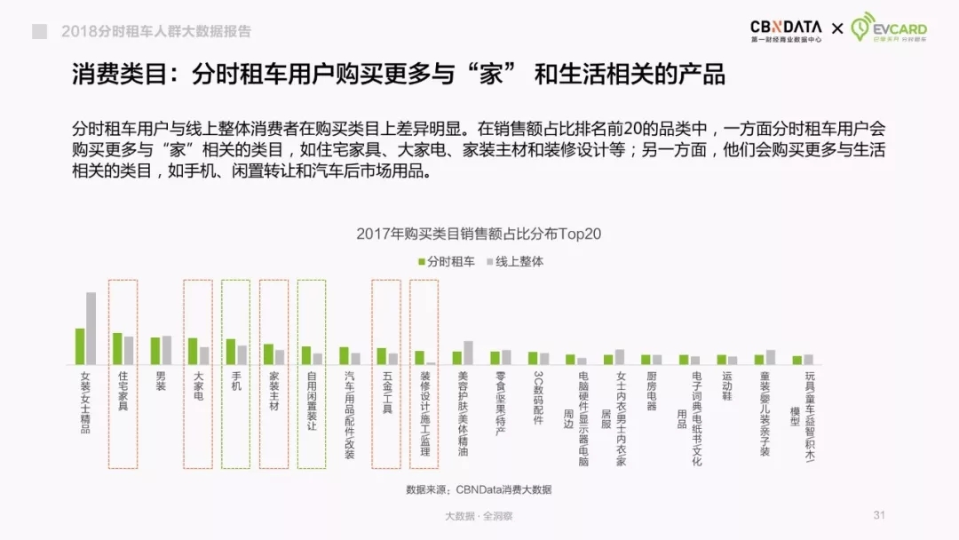从消费类目来看,分时租车用户呈现了居家型消费特征。与“家”相关的住宅家具、大家电、家装主材和装修设计等类目商品,在他们2017年消费额占比中排名前十。
