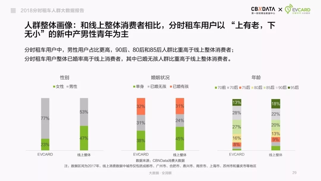相较于整体线上消费者的性别、婚姻、年龄和人均消费力状况发现,分时租车用户中男性占比更高;已婚率较高,其中已婚无孩人群占比更高;90后、80后和85后用户的比重更高;消费力也更强。可见“上有老,下无小”的新中产男性青年是分时租车的主要用户。