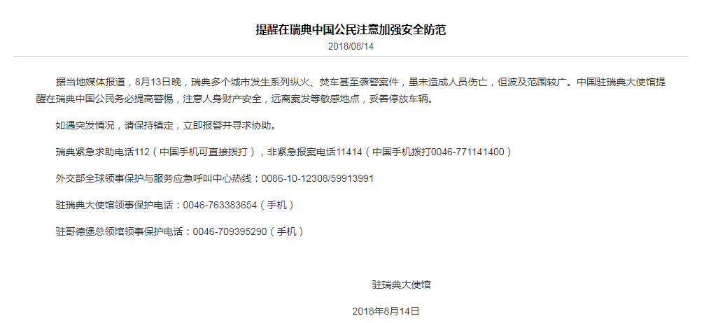 中国驻瑞典大使馆于14日发布通知,提醒在瑞典中国公民注意加强安全防范。通知称,瑞典多个城市发生系列纵火、焚车甚至袭警案件,虽未造成人员伤亡,但波及范围较广。中国驻瑞典大使馆提醒在瑞典中国公民务必提高警惕,注意人身财产安全,远离案发等敏感地点,妥善停放车辆。如遇突发情况,请保持镇定,立即报警并寻求协助。