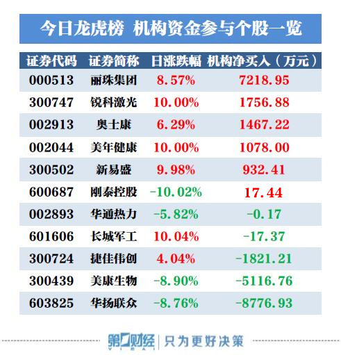 当天机构净买入前三的股票分别是丽珠集团、锐科激光、奥士康,净买入金额分别为7219万元、1757万元、1467万元。