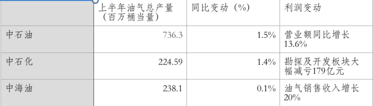根据梳理,上半年,中石油、中石化、中海油油气产量分别为736.3、224.59、238.1百万桶油当量,同比增长1.5%、1.4%、0.1%。