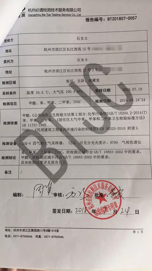 英子说,丈夫的病来得突然,加上媒体报道中不断出现的自如公寓甲醛超标的标题,让她怀疑这其中的关联。王某去世后,英子来到丈夫位于杭州市滨江区长江西苑的公寓,并于7月24日委托了一家具有CMA(中国计量认证)的空气检测公司,结果显示甲醛为0.132毫克每立方米(检测标准是小于等于0.10毫克每立方米)。