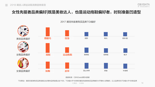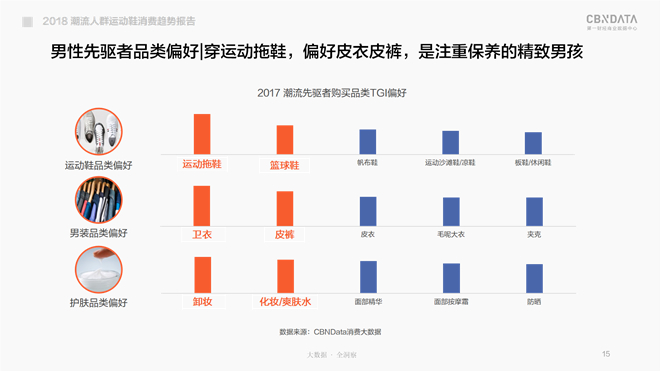 从潮流先驱者偏好购买的品类来看,女性潮流先驱者彰显了其美妆达人的特质,对运动拖鞋体现偏好,时刻准备凹造型;男性潮流先驱者是护肤小生初长成,穿卫衣也爱皮裤,同样对运动拖鞋体现了偏好。