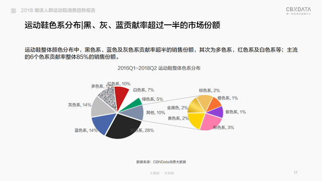 从2016年一季度到2018年二季度的运动鞋整体色系分布来看,黑色系、蓝色系及灰色系总共贡献了过半的销售份额,属大众主流之选;而多色系,红色系及白色系贡献了超过1/3的销售份额,同样不失热度。