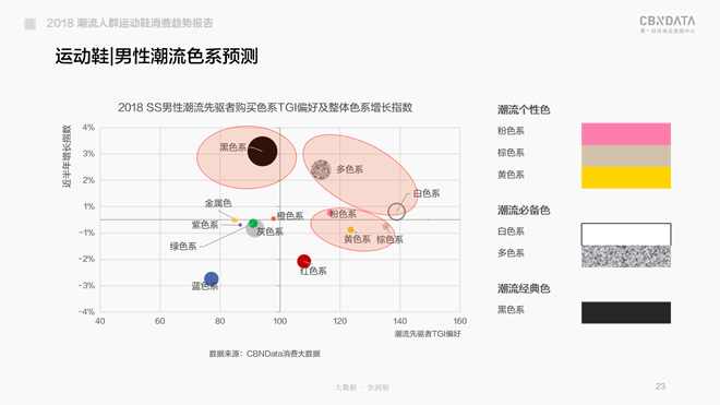 反观男性潮流先驱者在近半年对运动鞋款的色系偏好,以及整体色系运动鞋的销售情况可见:粉色系、棕色系、黄色系在整体市场上销售额占比增长不多,但却是潮男当下的宠儿;而相较于女性潮流先驱者,男性潮流先驱者对白色系运动鞋更显偏好,但在整体市场中销售份额增长情况却未及多色系来得显著,看来线上大众男同胞更接受多色系运动鞋;整体而言,黑色系运动鞋属国民男性大众之选,只是不太受潮男们的待见。