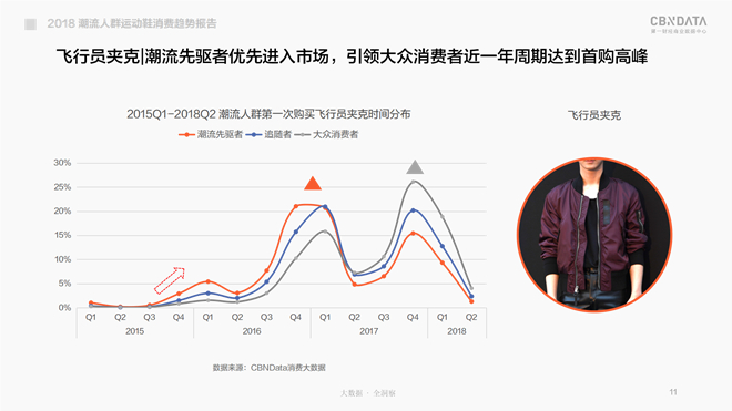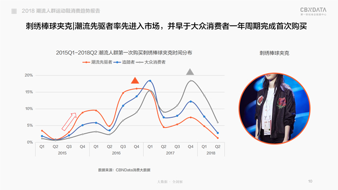 所谓线上潮流先驱者便是潮流界的“隐形KOL”,在CBNData《报告》中显示仅占整体潮流消费者5%的潮流先驱者身后,紧跟着35%的“入货及时,却买得不多”的潮流追随者,以及60%“下手晚,买得少”的大众型消费者。口说无凭,就以前两年的爆款“小白鞋”以及“刺绣棒球夹克|飞行员夹克”为例,为你验证潮流先驱者的“速度与激情”。