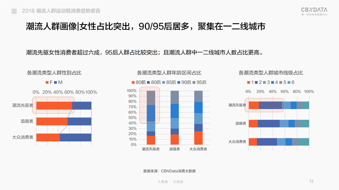 不得不说,年轻就是战斗力,CBNData《报告》中的潮流先驱者以90后和95后居多,其中95后人群占比尤为突出。不仅如此,这回还由“潮女”领衔,潮流先驱人群中的女性消费者占比超过六成,此外,居住在一二线城市的潮流先驱者人数占比也相对更高。