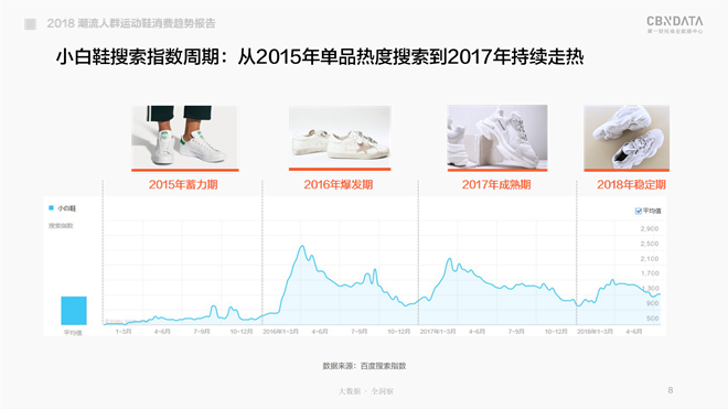 从小白鞋的线上搜索指数可见,其搜索热度从2015的小有起色到2016年的迅猛爆发,再到2017年的热度不减,直到如今依然保持稳定的消费热情,真可谓是足足火够两个年头的爆款单品,不过对于潮流先驱者而言,这大概是三个年头有余了吧。