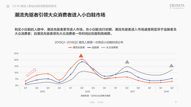 购买小白鞋的人群中,潮流先驱者更早进入市场。在小白鞋流行初期,潮流先驱者进入市场速度明显早于追随者及大众消费者;且潮流先驱者领先大众消费者一年时间达到首购高峰期。