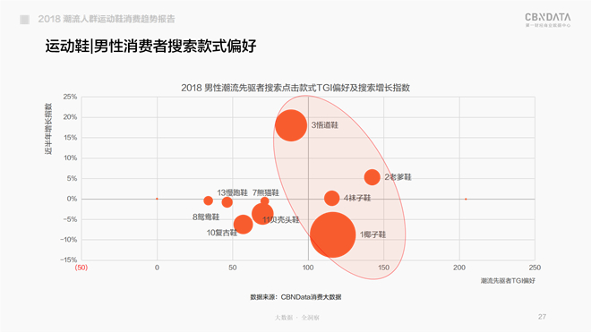 相比之下,在女潮人圈儿里没啥热度的“老爹鞋”,在潮男圈儿倒是时下的香饽饽,偏好度胜过了“袜子鞋”;颇得女潮人欢心的“椰子鞋”在潮男圈倒并非当红款,不过同样收获广大男同胞的厚爱;而“悟道鞋”暴增的热度也“烧”到了线上男性消费者中,不过依然不在潮男的“主视野”里。