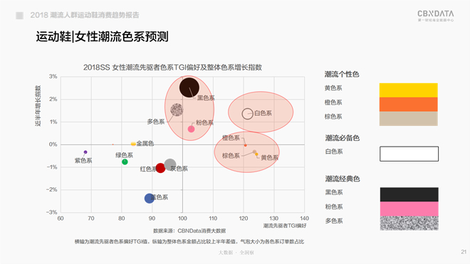 综合分析近半年整体不同色系运动鞋的销售增长情况,以及女性潮流先驱者对运动鞋色系的偏好情况发现:黄色系、橙色系、棕色系在整体市场上未见热度,但在这群女潮人中却颇显爱意,属值得关注的潜在爆款色;而白色系不论在整体市场,还是在女性潮流先驱者中都显热情,属当红潮流色;相对而言,黑色系、粉色系和多色系运动鞋更多地是大众消费者在买单。