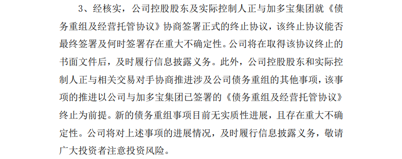 公告显示,经核实,公司控股股东及实际控制人正与加多宝集团就《债务重组及经营托管协议》协商签署正式的终止协议,该终止协议能否最终签署及何时签署存在重大不确定性。公司将在取得该协议终止的书面文件后,及时履行信息披露义务。此外,公司控股股东和实际控制人正与相关交易对手协商推进涉及公司债务重组的其他事项,该事项的推进以公司与加多宝集团已签署的《债务重组及经营托管协议》终止为前提。新的债务重组事项目前无实质性进展,且存在重大不确定性。公司将对上述事项的进展情况,及时履行信息披露义务,敬请广大投资者注意投资风险。