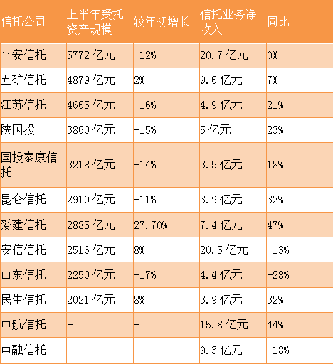 不过,张博的大多数同行在今年似乎不太顺利。12家已披露半年报的上市信托公司及上市公司旗下信托子公司数据显示,上半年受托资产规模较年初增长的只有4家,且大多为个位数增长,陕国投A(000563.SZ)、国投泰康信托、山东国信(01697.HK)、江苏信托、昆仑信托、平安信托等多家信托公司呈下滑趋势。
