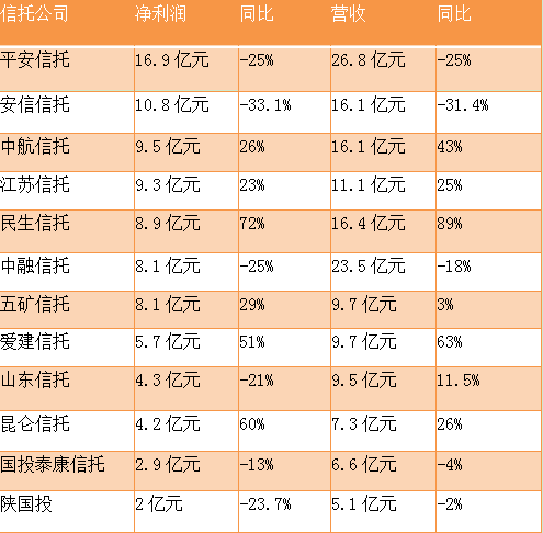 其中,安信信托 (600816.SH) 净利润10.8亿元,同比下滑33%,营业收入同比下滑31%;中融信托净利润为8.1亿元,同比下滑25%,营业收入同比下滑18%;国投泰康信托净利润为2.9亿元,同比下滑13%,营业收入同比下滑4%;陕国投A净利润为2亿元,同比下滑23.7%,营业收入同比下滑2%;平安信托今年上半年净利润为16.9亿元,同比下滑25%,营业收入也同比下滑25%。