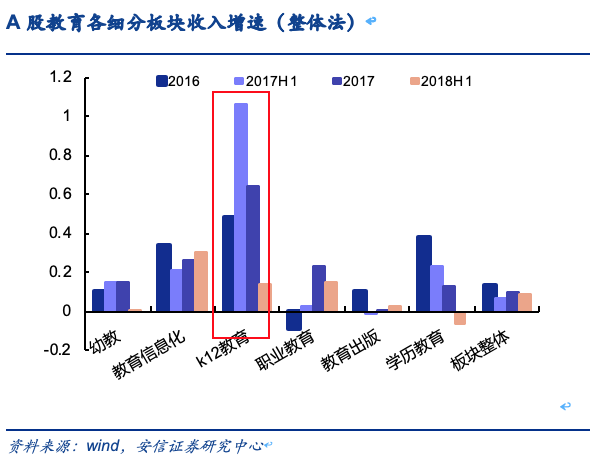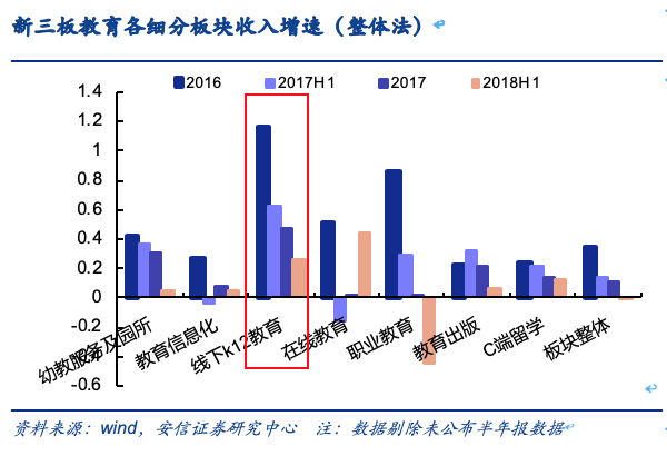 在资本市场,K12板块也是在教育行业中为数不多的有增长的领域。安信证券研报显示,今年上半年,A股教育行业整体营收同比增长约9%,净利润仅同比上涨0.58%;而新三板教育行业整体营收同比减少1.17%,净利润下降3.28%。