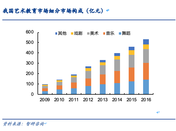 2016年,我国艺术教育市场规模为532亿元,增速为15%,以音乐、舞蹈和美术教育占据前三位。