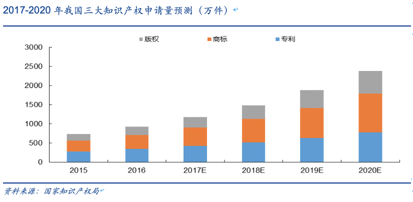 随着知识产权申请量逐年递增,安信证券预测,到2020年,知识产权确权市场规模预计将会达到760亿元,知识产权信息咨询服务市场至少有460亿元的市场规模,技术合同交易总额达到2万亿元,知识产权融资金额将达到1800亿元,知识产权维权业务接近500亿元。市场增长潜力巨大。