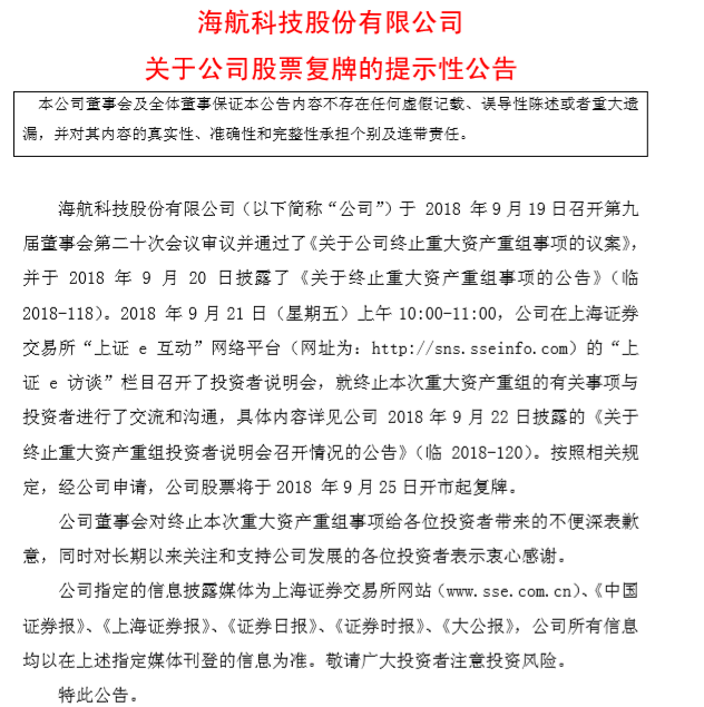 9月21日,海航科技晚间公告称,公司股票将于 2018 年 9 月 25 日开市起复牌。