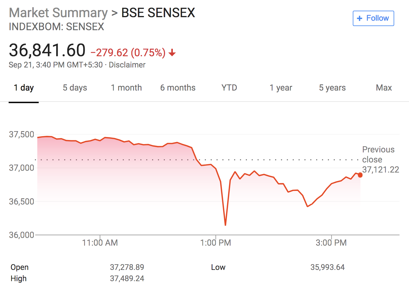 上周五早上还风平浪静的印度股市午后风云突变,孟买SENSEX 30指数几分钟内从上涨1%跳水至下跌3%,经历了近四年来最惊魂的一天。虽然印度央行和证监会上周末发表声明安抚市场情绪,周一印度股市依然惊魂未定,孟买SENSEX 30指数收盘再跌1.5%,其中金融板块重挫3.5%。