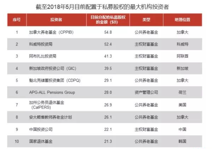 据投中白皮书,国外私募股权基金里最大的出资人都是养老基金和主权财富基金,占比高达46%,如加拿大养老基金、科威特投资局、新加坡政府投资公司。中国投资公司以221亿美元出资排名第九。
