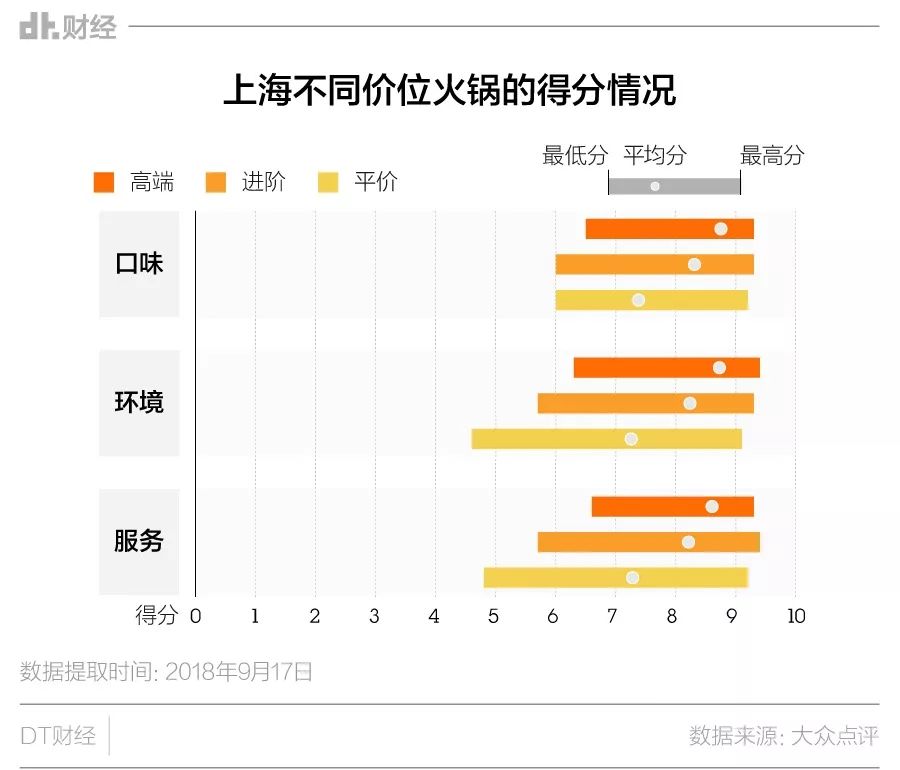 从平均分来看,高端火锅在口味、环境和服务评分上普遍高于进阶火锅,更是与平价火锅拉开明显差距。