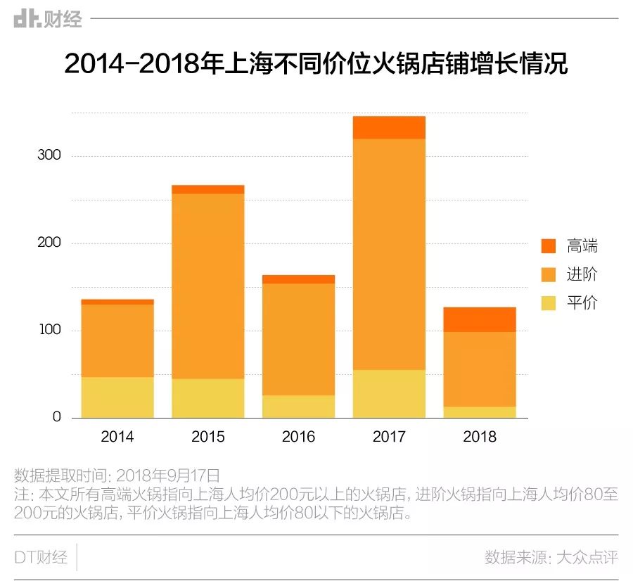 高(chi)价(bu)位(qi)的火锅店增量明显。按照人均价格将火锅店分成几个档,低于80元的是平价档,80-200元的是进阶档,高于200元的是高端档——从不同价位火锅店的增长情况来看,高端火锅在最近两年的新增数量大幅上升,超过了增长明显放缓的平价火锅。