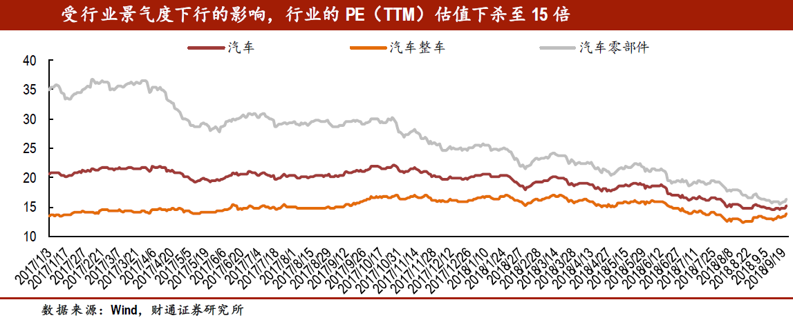 由于2017年以来汽车行业景气度逐渐下滑,利润增速放缓,行业整体估值PE(TTM)从2017年初的20倍杀到当前的15倍,目前行业估值已处于底部区间。零部件子版块的估值一路下行,从2017年初的35倍一路杀到目前的16倍。