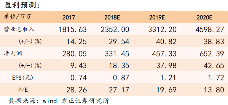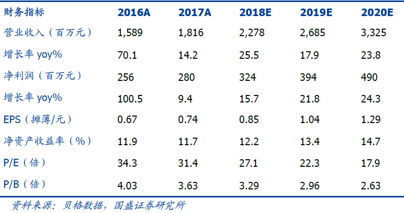 国盛证券预计公司2018~2020年归母净利润分别为3.24/3.94/4.90:亿元,同比分别增长15.7%/21.8%/24.3%,EPS分别为0.85/1.04/1.29元,对应估值分别为27.1/22.3/17.9倍,维持买入投资评级。