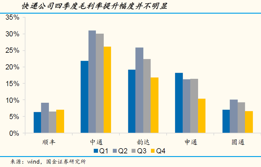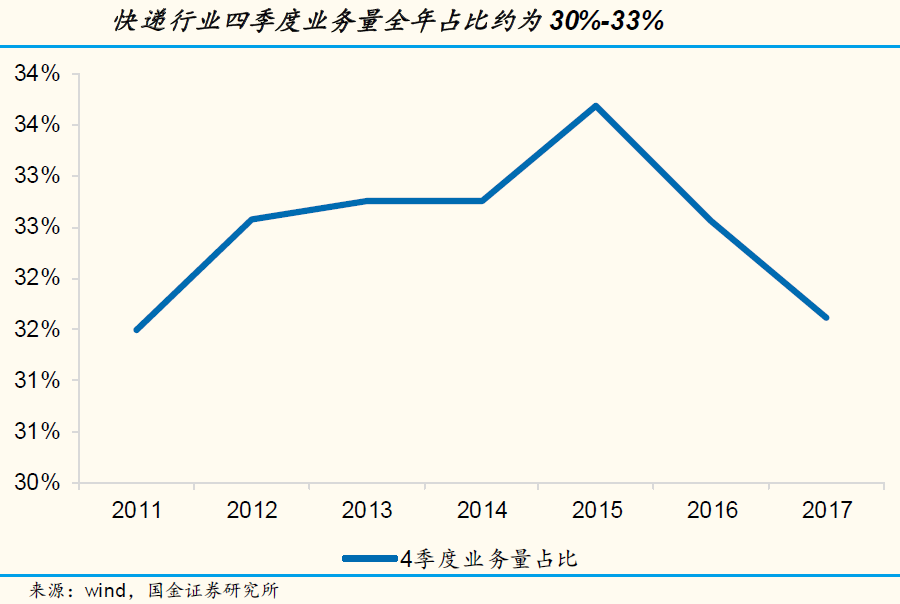 国金证券认为,快递行业在四季度取得超额收益的概率较高,或源自投资者对四季度业务量的高预期和事件驱动的催化剂效应,而非业绩的显著好转。一般而言,四季度件量占全年占比为30%~33%,但由于业务高峰往往会带来运力资源紧张和临时性部分成本的上升,四季度毛利率提升幅度并不明显。