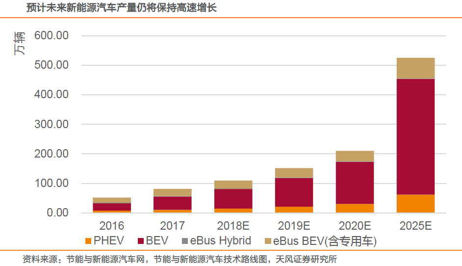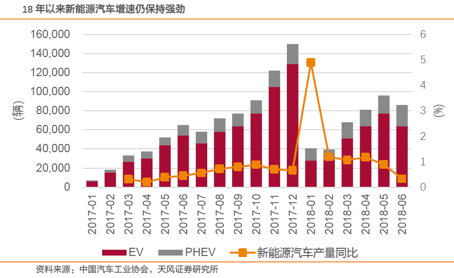 据中国汽车工业协会数据,进入2018年以来,新能源汽车产销规模继续维持高速增长,1-5月新能源车产量增速维持在80%以上,6月补贴新政实行后总量增速有所回落,上半年累计生产新能源汽车41.08万辆,同比增长94.52%。据乘联会数据,2018年6月国内新能源乘用车产量达7.17万辆,同比增73.04%,但环比回落22.27%。对产量进行拆分,减量主要来自新政下低续航的A00产量的迅速收缩,同、环比分别回落24.53%和62.77%,同时A0、A级新能源车增长持续强劲,A0同、环比分别增408.99%和38.74%、A级同、环比分别增193.46%和7.86%,PHEV保持持续增长。天风证券认为,整体看新政后新能源车市场高低端车型呈现此消彼长的态势。