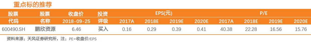 天风证券认为,国内补库存周期大概率即将开启,钴价有望企稳,建议关注钴行业的新进入者鹏欣资源(600490.SH)。鹏欣资源作为钴行业的新贵,2016年公司定增募资17亿元投建2万吨/a阴极铜生产线项目及7000金属吨/a氢氧化钴项目。同时公司公告截止2018年7月25日,项目上已采购含钴金属量482.13吨的钴矿石,能够满足氢氧化钴生产线2019年1月以前的原料需求量。按照目前33美元/磅的钴价测算,公司钴冶炼产能达产后业绩有望达到1.43亿美元。