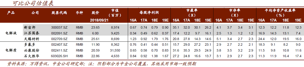 中金公司认为成本端溶剂涨价和需求旺季来临推动电解液量价齐升,维持2018/2019e每股盈利预测0.79/0.90元。公司当前股价对应30/26倍2018/19年P/E。维持“推荐”评级。