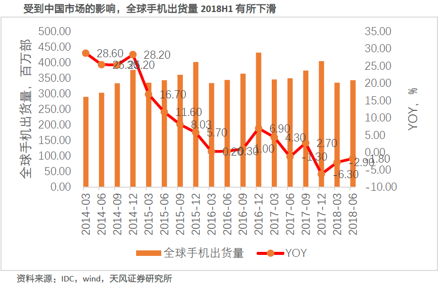 天风证券指出,上半年国内手机出货量持续走低,随着消费旺季的来临,下半年有望回暖。2017年,中国智能手机市场遭遇增长瓶颈,出货量持续下滑。进入2018年下滑势头继续,来自工信部中国信通院的数据显示,2018年2月中国国内出货量仅为1812.2万部,同比下降38.7%,跌入谷底。不过伴随着第二季度厂商的集中发力,5月中国国内手机出货量达到3783.6万部,同比增长1.2%,近14个月来首次转正,止跌回稳。随着中国市场的企稳,全球智能手机出货量有望重回正增长通道。