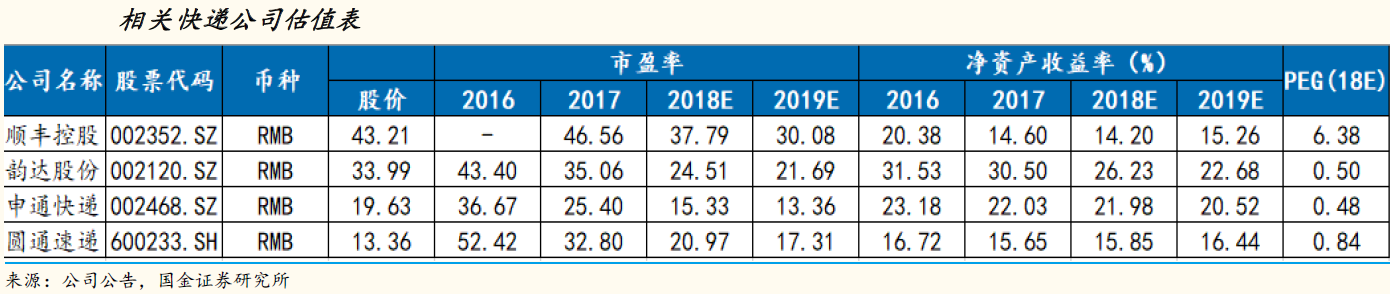 国金证券继续看好护城河最深、新业务成果初现、业务量增速加快的顺丰控股(002352.SZ),同时推荐具备成本端优势、信息化管理与自动化设备投入方面走在行业前列的韵达股份(002120.SZ)。此外,申通快递(002468.SZ)在完成北京、武汉等城市的转运中心的资产收购,提升中转质量,提升服务质量,业务量增速持续提升,产能投资提速转化为市场份额回升。