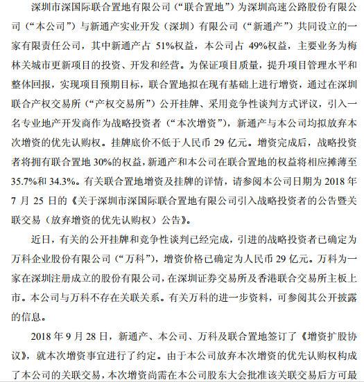深高速9月28日港交所公告称,有关的公开挂牌和竞争性谈判已经完成,引进的战略投资者已确定为万科,增资价格已确定为人民币29亿元。