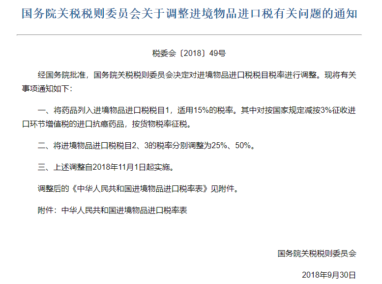 国务院关税税则委员会9月30日发布关于调整进境物品进口税有关问题的通知,将药品列入进境物品进口税税目1,适用15%的税率。其中对按国家规定减按3%征收进口环节增值税的进口抗癌药品,按货物税率征税;二、将进境物品进口税税目2、3的税率分别调整为25%、50%。