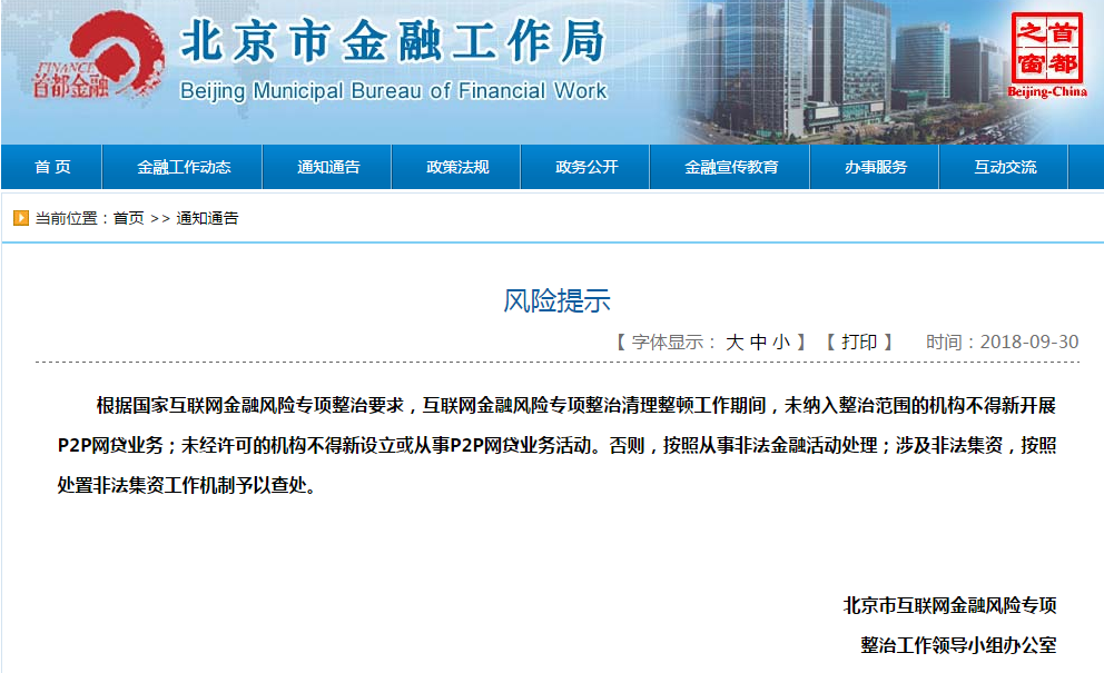 9月30日,北京市金融局发布风险提示称,互联网金融风险专项整治清理整顿工作期间,未纳入整治范围的机构不得新开展P2P网贷业务;未经许可的机构不得新设立或从事P2P网贷业务活动。否则,按照从事非法金融活动处理;涉及非法集资,按照处置非法集资工作机制予以查处。