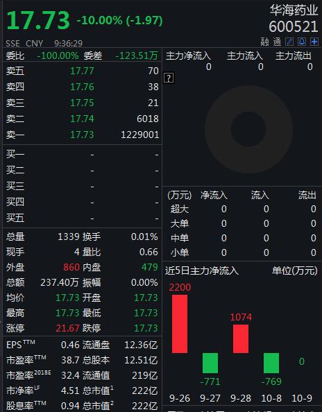 10月9日,华海药业开盘再度跌停,报17.73元,截至发稿,封单近123万手。